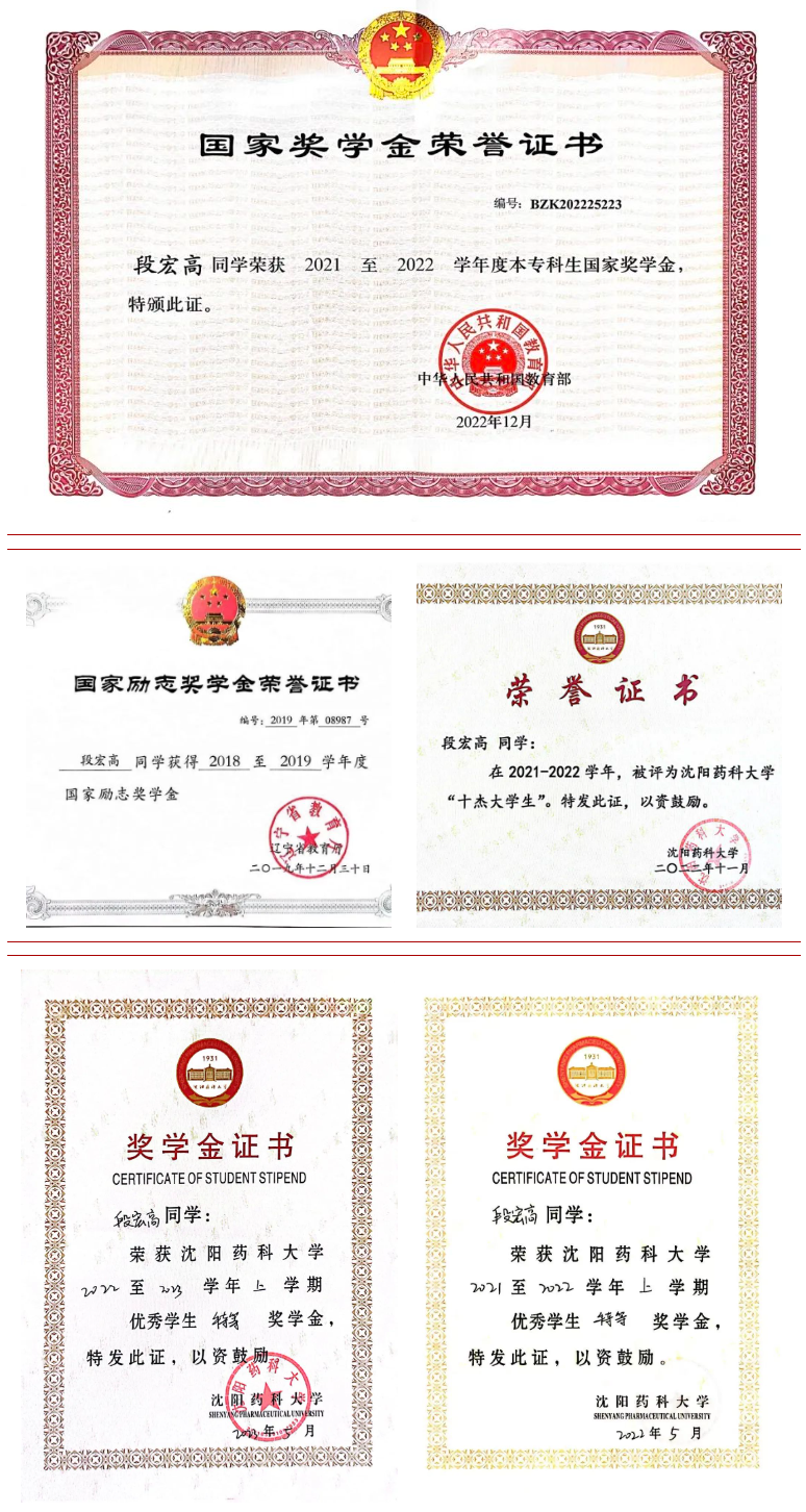 段宏高,澳门十大网投正规官网平台药物化学专业2020级本科生。前五学期平均成绩学院排名前1%,曾获国家奖学金2次,“十杰大学生”“十佳学习标兵”等各1次,曾服役于中国人民武装警察部队,获嘉奖和“四有”优秀士兵奖章各1次。发表SCI文章1篇,参与省级大学生创新项目1项,现已保研为北京大学药学院直博生(拟录取)。