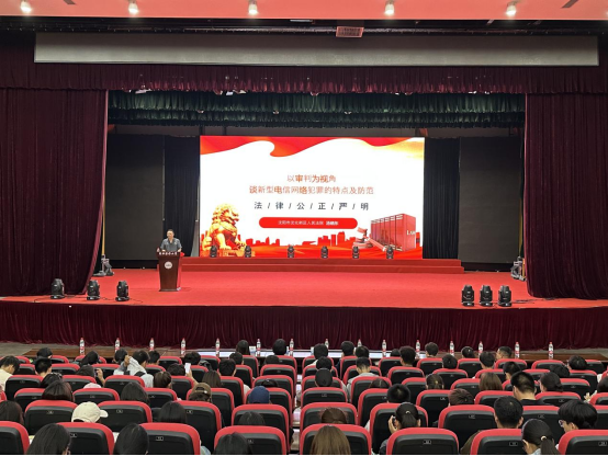 汤晓东作“以审判为视角谈新型电信网络犯罪的特点及防范”主题讲座。他为同学们介绍了吸粉引流、“手机口”诈骗、侵犯个人信息等新型诈骗方式,从帮信罪、掩隐罪定义、涉嫌犯罪行为流程及后果责任等方面,详细讲解了“帮信罪”的伎俩和套路,教导现场师生警惕“帮信陷阱”,避免沦为电诈帮凶,并为参会同学普及了电信网络诈骗、毒品犯罪的特点及防范等法律知识,帮助学生树立遵守法律、运用法律的意识。