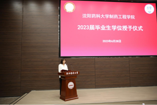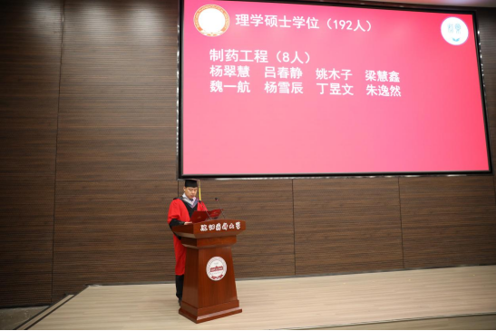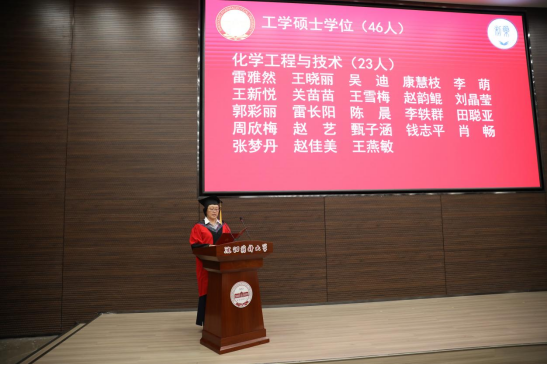 学院院长、院学位评定分委员会主任委员赵临襄宣读2023届博士学位授予名单;药物化学学科副主席许佑君、制药工程学科副主席刘洋、化学学科主席胡春、化学工程与技术学科主席侯晓虹分别宣读各学科2023届硕士学位授予名单;制药工程专业负责人刘丹、药物化学专业负责人郭春、环境科学专业负责人张聪璐、应用化学专业负责人胡春分别宣读2023届学士学位授予名单。