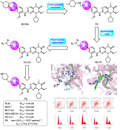 澳门十大网投正规官网平台侯云雷/宫平课题组采用基于结构的药物设计策略,以BI 2536为先导化合物,运用构象限制和生物电子等排药物设计策略,得到了一系列含噁二唑片段的二氢蝶啶酮类衍生物,其中化合物21g表现出显著的PLK1抑制能力,其IC50值为0.45 nM,并且对多种肿瘤细胞系具有显著的抗增殖活性(MCF-7 IC50=8.64 nM,HCT-116 IC50=26.0 nM,MDA-MB-231 IC50=14.8 nM和MV4-11 IC50=47.4 nM)。此外,化合物21g在小鼠中表现出比BI 2536更好的药代动力学特性(AUC0-t=111227 ng·h·mL-1vs 556 ng·h.mL-1),口服生物利用度为77.4%,并且在Balb/c小鼠急性毒性试验(20 mg/kg)中未观察到明显的毒性。化合物21g可使HCT-116细胞阻滞在G2期,并以剂量依赖的方式诱导细胞凋亡。