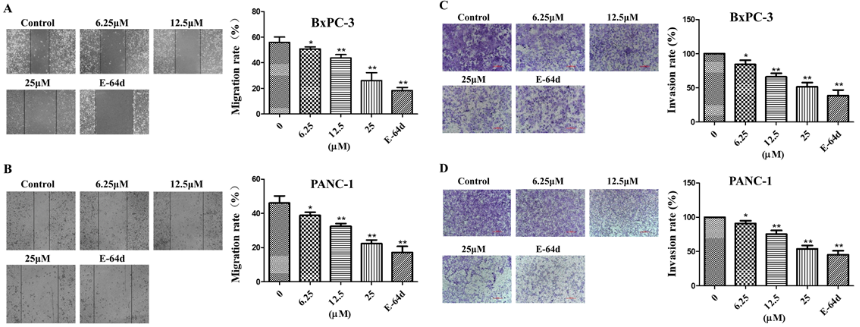 图2. ASPER-29 inhibited the migration and invasion of pancreatic cancer cells. BxPC-3 (A) and PANC-1 (B) cells were scratched by 10 μl pipet tips, and then incubated with different doses of ASPER-29 and E− 64d (25 μM) for 48 h. BxPC-3 (C) and PANC-1 (D) cells were incubated with different doses of ASPER-29 and E− 64d (25 μM), and then the cells in the upper cham- bers coated by Matrigel (0.23 mg/mL) were stained with 0.1% crystal violet to investi- gate the effect of ASPER-29 on the invasion of BxPC-3 and PANC-1 cells. The data are presented as the mean ± SD from three in- dependent experiments. *p < 0.05, **p < 0.01 vs. control group.