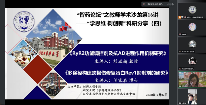 2022年12月2日下午,澳门十大网投正规官网平台举办了“智药论坛”之学术沙龙第16讲“学思维 树创新”科研分享活动,药物化学教研室主任刘亚婧教授和闻家辰老师分别进行了题目为“RyR2功能调控剂及抗AD进程作用机制研究”和“多途径构建跨损伤修复蛋白Rev1抑制剂研究”的精彩报告。会议由药物化学系主任刘丹教授主持,学院教师和研究生共260余人参会。