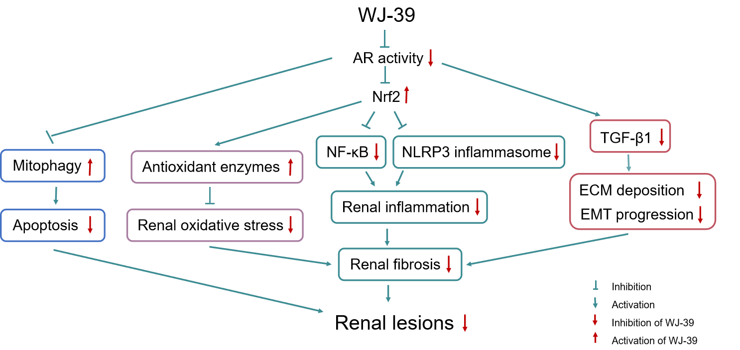 WJ-39是一种基于糖尿病并发症关键靶点醛糖还原酶结构设计的喹啉酮乙酸类化合物,主要用于糖尿病肾病的治疗,改善肾功能。作用机制研究表明,WJ-39能够激活Nrf2通路、增加内源性抗氧化酶产生,对DN大鼠肾脏氧化应激损伤具有显著的抑制作用。WJ-39对DN大鼠肾脏具有显著的抗炎和足细胞保护作用,这与激活Nrf2通路、抑制NF-κB通路和NLRP3炎症小体活化共同作用有关,且对NLRP3炎症小体的抑制作用优于厄贝沙坦和依帕司他。研究还表明,WJ-39具有显著的抗肾脏纤维化作用,其机制可能与抑制TGF-β1/Smad通路激活和EMT有关。此外,WJ-39可能通过改善线粒体动力学异常、促进线粒体自噬并抑制细胞凋亡发挥对DN大鼠肾小管的保护作用,其促进线粒体自噬作用优于依帕司他。同时,WJ-39在包括灵长类动物食蟹猴在内的相关动物实验中,表现出较好的药代动力学性质和优良的安全性。