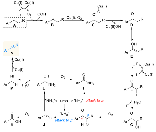 综上所述,以CuOAc为金属催化剂、尿素为氮源、碘化锂为添加剂、氧气为氧源的反应体系可以实现各类烷基取代的芳环及芳杂环型底物转化为有机腈类产物,为不饱和碳氢资源的转化和有机腈的合成提供了一种高效、绿色且条件温和的新方法。