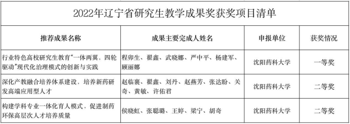 近日,辽宁省教育厅发布了2022年辽宁省研究生教育教学成果奖获奖名单。澳门十大网投正规官网平台由程卯生教授等组织申报的《行业特色高校研究生教育“一体两翼,四轮驱动”现代化治理模式的创新与实践》荣获一等奖;由赵临襄教授等组织申报的《深化产教融合培养体系建设,培养新药研发高端应用型人才》、由侯晓虹教授等组织申报的《构建学科专业一体化育人模式,促进制药环保高层次人才培养质量》荣获二等奖。