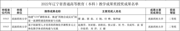 5月24日,辽宁省教育厅发布了《辽宁省教育厅关于公布2022年辽宁省普通高等教育(本科)教学成果奖获奖名单的通知》(辽教函[2022]68号)。澳门十大网投正规官网平台由翟鑫教授等组织申报的《构建“1234”课程体系,推进“药物合成反应”国家一流课程建设的探索与实践》、由赵燕芳教授等组织申报的《基于创新型人才培养的药物化学课程多元立体化教学体系的构建与实践》荣获二等奖。