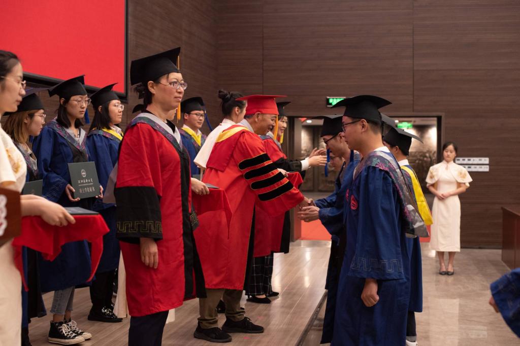 在同学们的欢呼声中,仪式现场播放了授予学位视频,以线上方式为云端的毕业生带上学位帽,拨穗正冠。学位的授予代表着全体毕业生圆满完成了学业,即将扬帆起航,驶向人生新征程,线下与云端结合的仪式感承载着学院对毕业生开创美好未来的希冀与期盼,也凝聚着毕业生对学院的归属感和荣誉感。