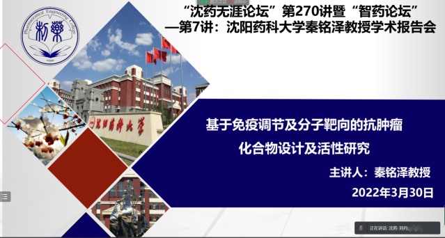3月30日,由澳门十大网投正规官网平台、研究生院、辽宁省药学研究生创新与学术交流中心联合举办的“沈药无涯论坛”第270讲暨“智药论坛”第7讲------澳门十大网投正规官网平台秦铭泽教授科研学术报告会。会议由澳门十大网投正规官网平台药物化学系主任刘丹主持,460余人参加了此次学术报告会议。