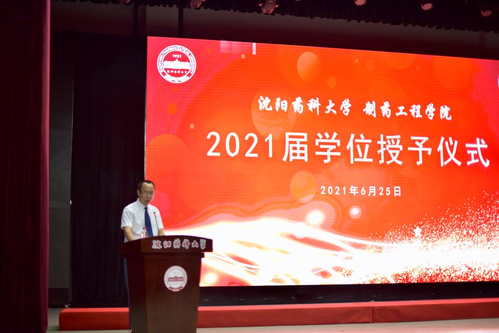 院长助理、药物化学教研室教师刘洋教授代表学院教师,为2021届毕业生送上毕业寄语。他向获得学位的毕业生们表示诚挚的祝贺和美好的祝福,希望同学们永葆初心,脚踏实地,志存高远,勇于拼搏,在新征程中展翅高飞,实现人生新的跨越。