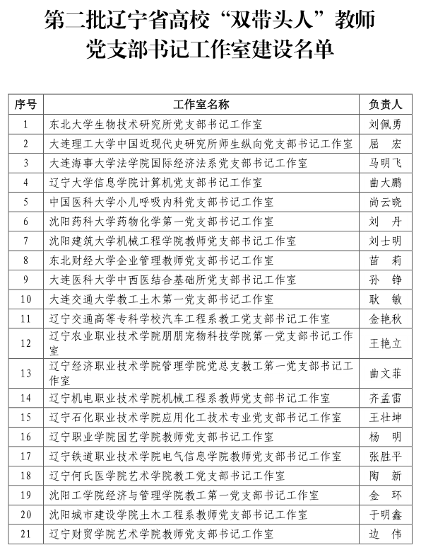 近日,辽宁省委教育工委办公室发布《关于公布第二批辽宁省高校“双带头人”教师党支部书记工作室建设名单的通知》,全省21个本、专科高校教师党支部工作室位列建设名单。其中,由药物化学教研室主任刘丹教授负责的澳门十大网投正规官网平台药物化学第一党支部书记工作室成功入选第二批辽宁省高校“双带头人”教师党支部书记工作室。