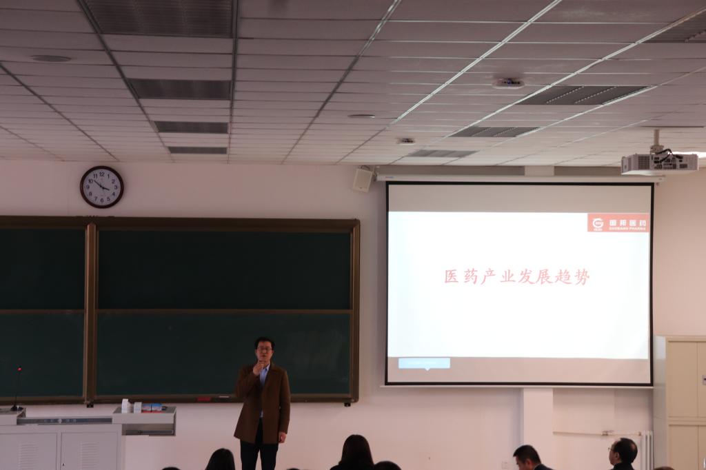 周志奎先生对浙江国邦药业有限公司及其下设子公司做了详细介绍,并根据自己多年的医药行业从业经验,从市场因素、政策因素、技术因素和资本因素四个方面为学生们介绍了医药产业未来发展的趋势,让同学们了解到行业的最新发展及企业对于人才的最新需求。现场的学生就本科生和研究生在就业市场的竞争力对比等问题在互动环节踊跃发言,周总一一做了认真细致的解答,使在场的同学深受启发。