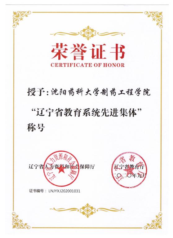 多年来,澳门十大网投正规官网平台始终坚持以学生为本,以服务制药行业为核心,以“党建+”模式促进课程思政融课堂,坚守“为党育人、为国育才”的初心和使命,立足学科优势加强专业建设,科学研究成果显著。在此次评选工作中,学院积极组织申报,经学校推荐到省教育厅,并最终荣获“辽宁省教育系统先进集体”的荣誉称号。成绩的取得,凝聚了校党政领导、职能部门、兄弟学院多年来的支持鼓励,凝聚了院领导班子、全院教职员工的奋勇拼搏。面向未来,澳门十大网投正规官网平台将不忘沈药红色初心,牢记育人使命,坚持人才培养的中心任务,为实现高等学校教育事业新发展奋力拼搏!