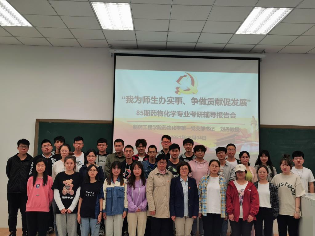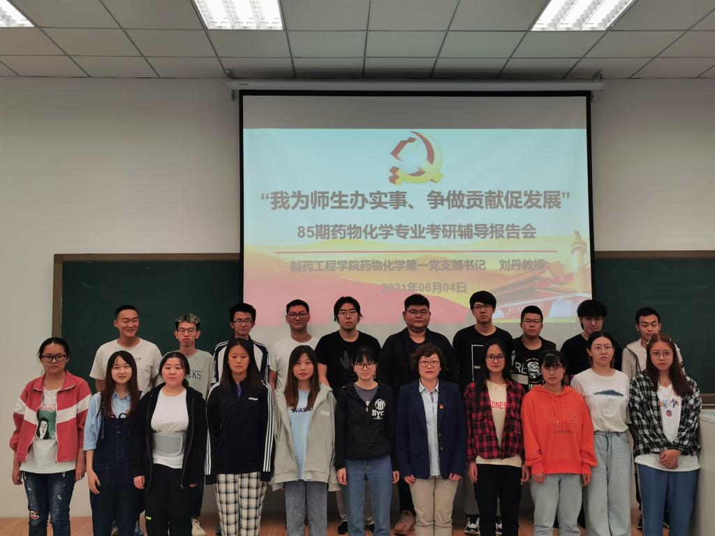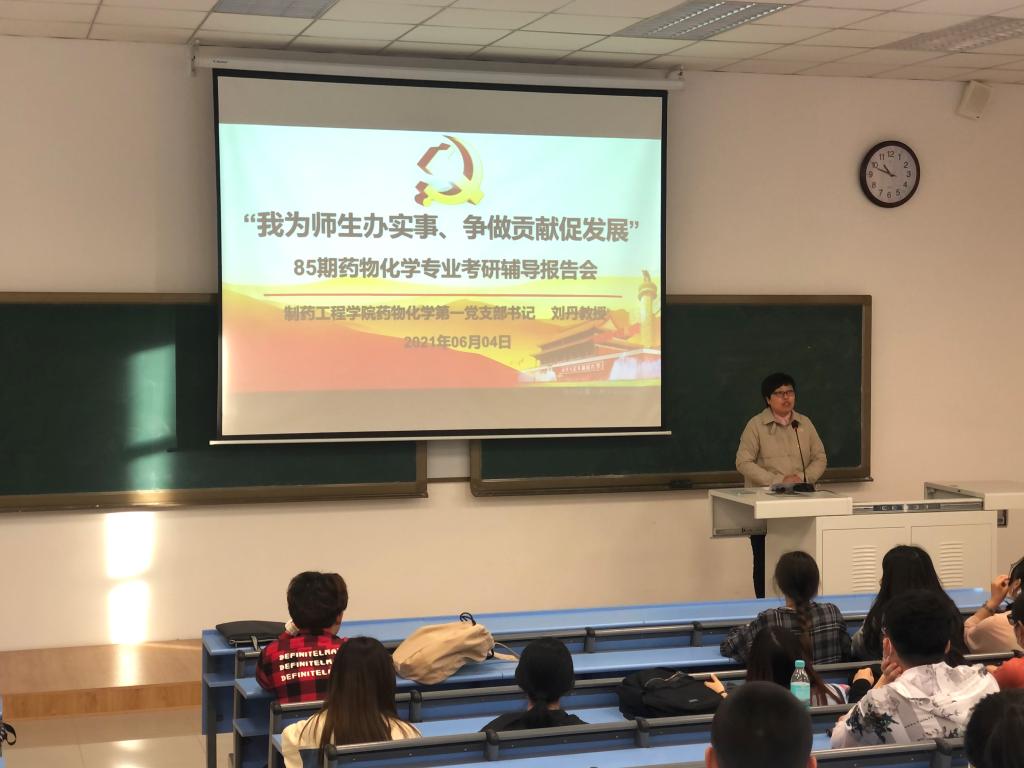 为更好地促进党史学习教育走深走实,充分发挥澳门十大网投正规官网平台药物化学第一党支部辽宁省高校“双带头人”教师党支部书记工作室的示范作用,将“我为师生办实事 争做贡献促发展”落到实处,6月4日晚,在第四教学楼204教室,药化第一党支部书记刘丹教授为85期药物化学专业学生做考研辅导报告,药化一班、药化二班共55名有意向参加考研的同学参与了此次考研指导会。院党委书记李哲出席并主持报告会。